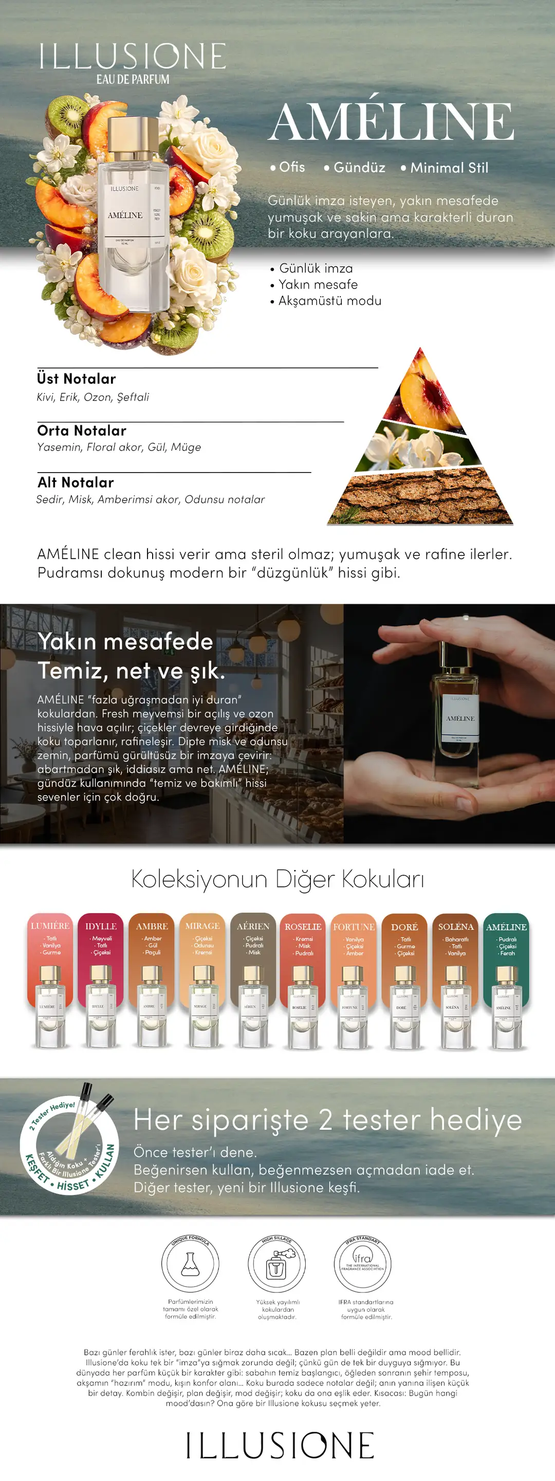 Koku Profili: İnce beyaz çiçekler ve yumuşak pudra dokunuşları etrafında şekillenen, hafif odunsu altyapıyla desteklenen ferah bir çiçeksi-pudralı kompozisyon.