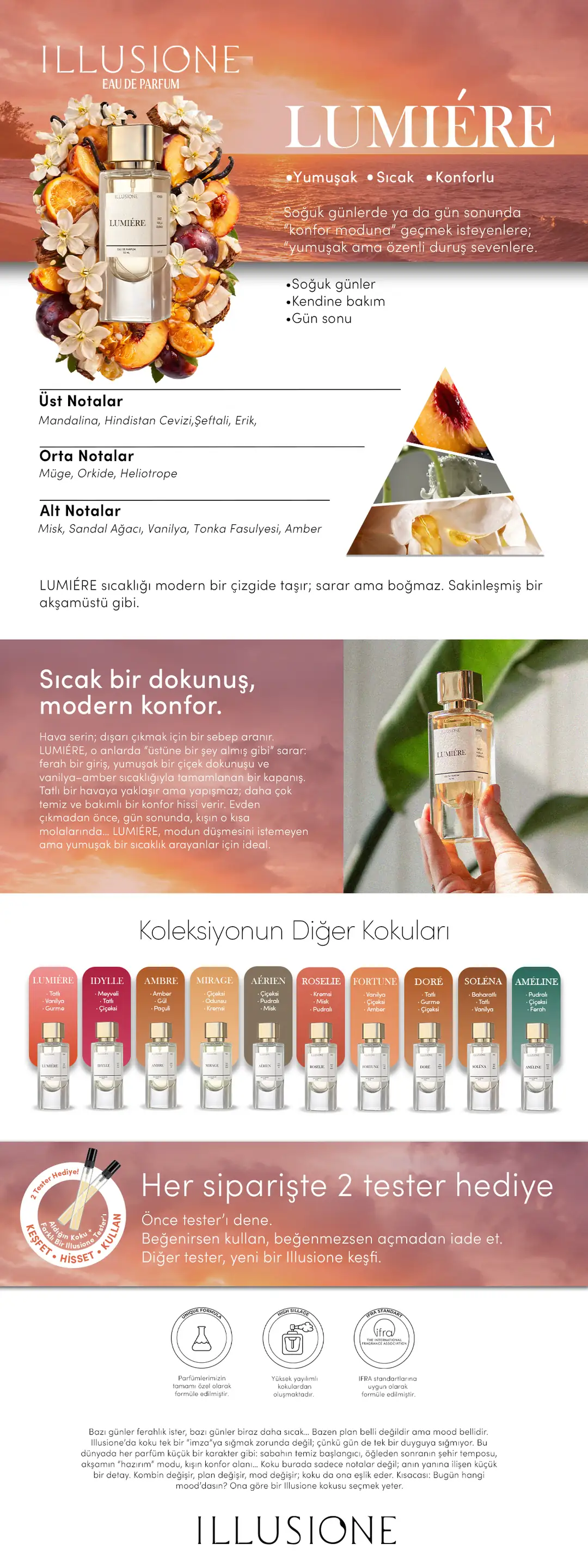 Lumiére, narenciye fısıltılarıyla açılır, şafağın ilk ışıklarını anımsatan parlak melodilerle duyuları uyandırır. Bu üst notalar, yeni bir günün vaadini taşıyan hafif bir esinti gibidir. Kokunun kalbinde, müge ve orkidenin sarhoş edici kokularıyla doğanın zamansız güzelliği öne çıkar, cilt üzerinde narin bir şiir gibi açılır.Kokunun derinliklerinde, misk, vanilya ve amberin sıcak ve şehvetli notaları yer alır, kullanıcıyı rahatlatıcı bir kucaklamayla sarar. Lumiére, büyüleyici melodisiyle kalpleri büyüleyen parlak bir yıldız olarak ortaya çıkar ve arkasında fısıldanan vaatlerden oluşan bir iz bırakır.