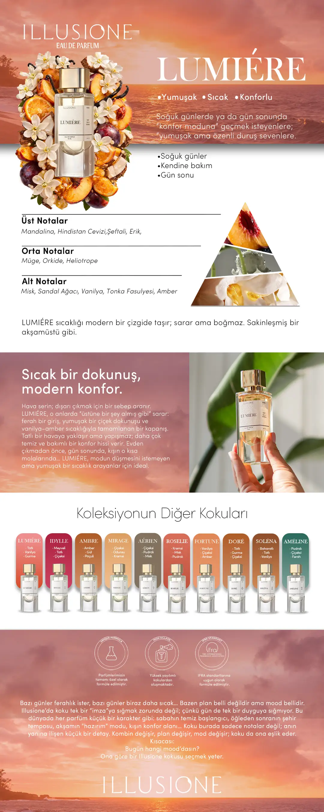 LUMIÉRE Eau de Parfum, konfor hissini modern bir sıcaklıkla taşıyan yumuşak bir koku. Mandalina ve hindistan ceviziyle kremamsı bir giriş yapar; şeftali–erik dokunuşu, müge–orkide–heliotrope kalbiyle daha sakin bir akışa döner. Misk, sandal, vanilya, tonka ve amber ile sarıcı ama boğmayan bir kapanış verir.