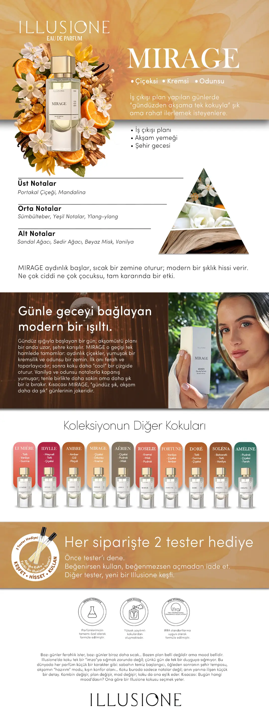 Mirage, güneşli günleri ve gizemli antik duvarları çağrıştıran bir kokudur. Portakal çiçeği ve mandalina ile başlayan narenciye notaları, güneşin sıcaklığını yansıtır. Kalpte, sabırotu ve sümbülteber çiçek açarak romantik bir atmosfer yaratır, geçmişin aşk hikayelerini fısıldar. Koku, vanilya, sedir ve sandal ağacının toprak kokulu notalarıyla son bulur, doğanın gücüne ve dayanıklılığına övgü sunar. Mirage, hafıza ve hayal gücüyle dokunmuş, güneşle ıslanmış başka bir dünyaya davet eden büyüleyici bir yolculuktur.