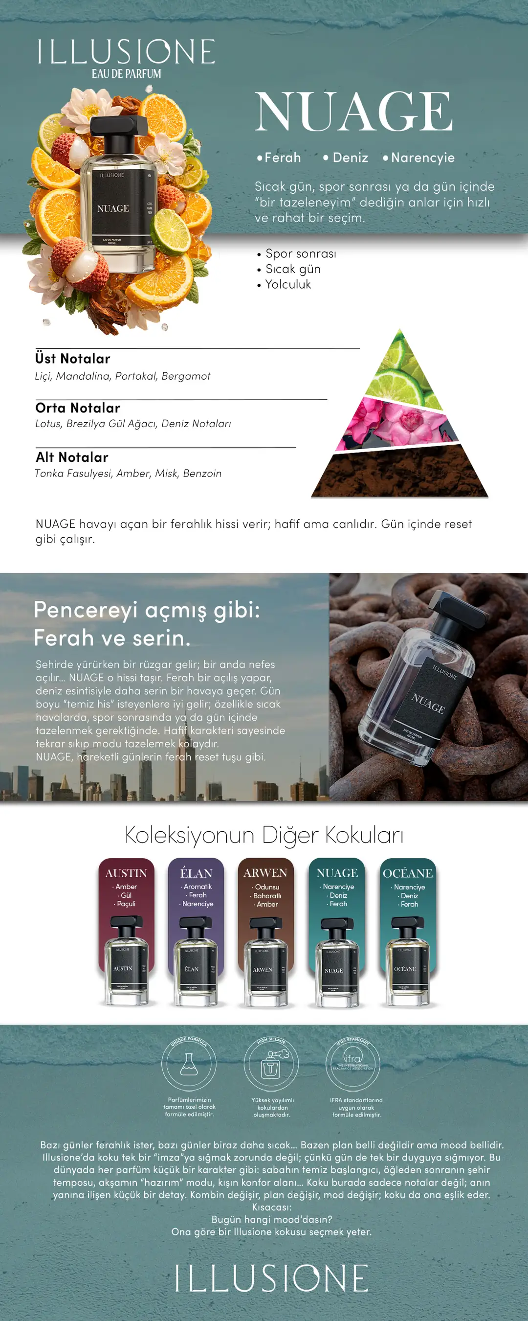 NUAGE Eau de Parfum, gün içinde tazelenme hissi veren ferah ve canlı bir seçenek. Liçi, mandalina, portakal ve bergamotla aydınlık açılır; lotus, brezilya gül ağacı ve deniz notalarıyla serin bir esintiye döner. Tonka, amber, misk ve benzoin ile yumuşakça tutunur.