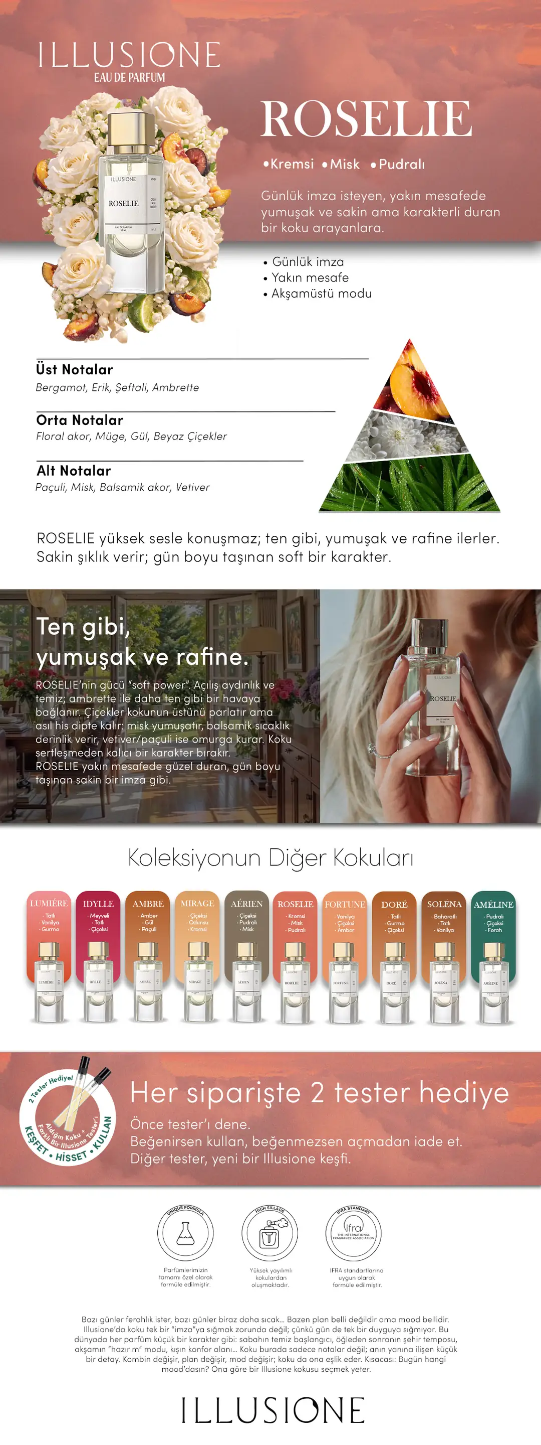 Koku Profili: Yumuşak çiçek yaprakları, kremsi dokunuşlar ve tenle bütünleşen misk tabanı üzerine kurulu, pudramsı bir kompozisyon.